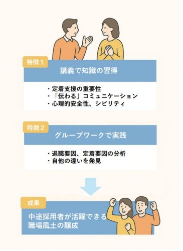本研修では、受け入れ側に焦点を当て、必要な知識・スキル・心構えを身につけていただくことで、中途採用者が活躍しやすい職場風土の醸成を目指します。