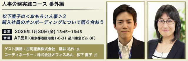 そして、第3回は、東京の修了者も増えたことから、初めて東京で開催いたします。ゲスト講師として、古河産業株式会社 企画戦略統括部門 人事部の藤井 祐作様にお越しいただき、新入社員のオンボーディングをテーマに、独自の新入社員研修や配属先部門を巻き込んだ取り組みなど、人事と現場の温度差をなくし、全社で新入社員を育成している事例をエピソードや想いとともにお話しいただきます。そして、松下直子講師との対談、参加者も含めたディスカッションを通して、明日からのヒント・活力にしていただきます。人事労務実践コースの参加者のみならず、本テーマにご興味のある人事の方もご参加いただけますので是非ご興味ある方は、ご参加ください。