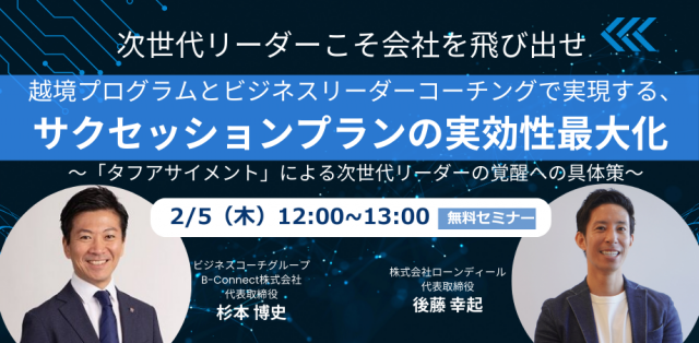 本セミナーでは、最高のタフアサイメントとしての越境プログラムと、その経験を自組織の課題解決や活性化を推進する行動へ確実に繋げるビジネスリーダーコーチングの伴走モデルを提示。両社のソリューションを組み合わせることで、サクセッションプランの実効性を最大化させる具体策をお伝えします。