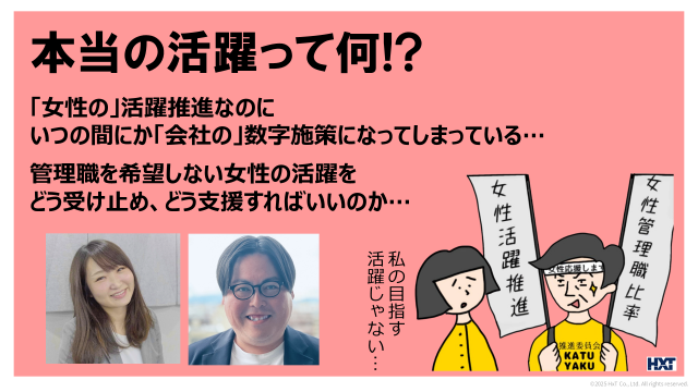 情報はインターネットやAIでいくらでも得られる今、本当に必要なのは「現場」と「社員」の実感です。だからこそ本セミナーでは、制度説明は最小限にして、“現場に立ち返る時間”を大切に、テンポよく20分でお届けします。現場のリアルな声と、制度の限界を超えた“本質”を共有し、4コマ漫画「何のための女性活躍推進?」を解説。短時間だからこそ、原点に立ち返る機会にしていただければと思います。