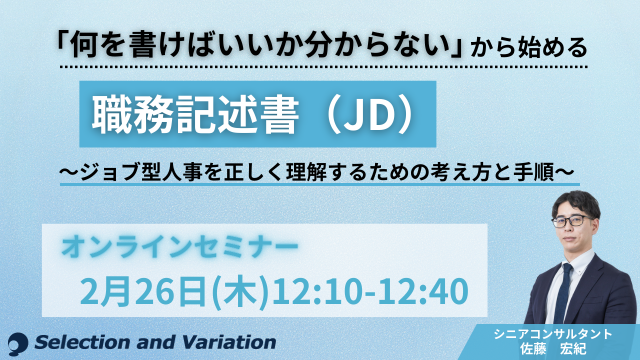 本セミナーは、JDに関する全2回シリーズの第1回「作成編」として、「ジョブ型」という言葉の正しい理解を起点に、JDがなぜ必要なのか、どのような考え方で設計すべきか、そして実際にどのような手順で作成するのかを、人事コンサルタントの視点から分かりやすく解説します。