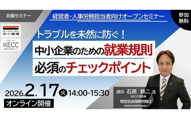 中小企業において、就業規則は従業員が守るべきルールであるとともに、会社を守るために必要なものです。相次ぐ法改正に加え、就業規則の不備が問題となり、思わぬトラブルに発展する可能性もあります。「昔作ったまま見直していない」「雛形をそのまま使っている」「現場の実態と規則がズレている」、こうした状態は、様々な労務トラブルに発展するリスクを高めます。定期的な見直しを行い、実態に合わなくなった箇所は変更し、法改正に応じて最新の状態にする必要があります。本セミナーでは、中小企業の経営者・人事担当者の方を対象に、法改正やトラブル事例を基に、就業規則見直しのポイントを解説します。
