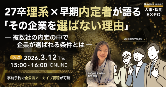 そこで本講演では、既に複数内定を獲得している27卒理系学生の3名が登壇。