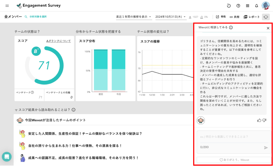 同規模・同業界とのスコア比較や、優先的にサポートすべきチーム・メンバーの抽出など、改善の方向性を見極める多彩な機能を備えています。さらに、機械学習を活用したAIがチャット形式で分析や改善策の相談に対応するため、スコアの読み解きに不慣れな方でも、安心して活用いただけます。