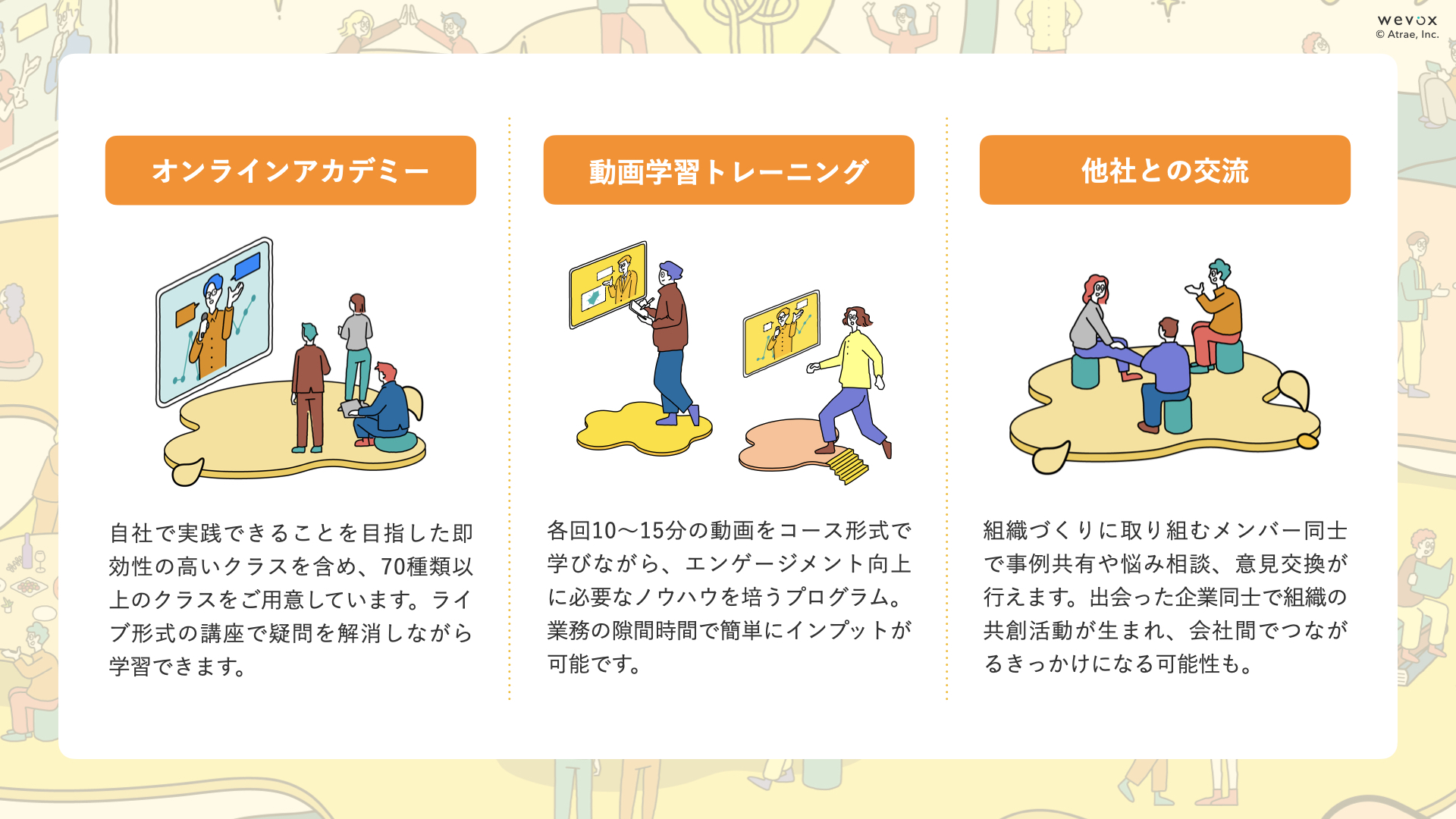 ワークショップキットやお役立ち資料、セミナーなど、サーベイを活かした組織づくりのための無料コンテンツを多数提供。オンラインアカデミーや動画学習、他社との交流機会などを通じて、データから「行動」を生み出す循環をサポートします。
