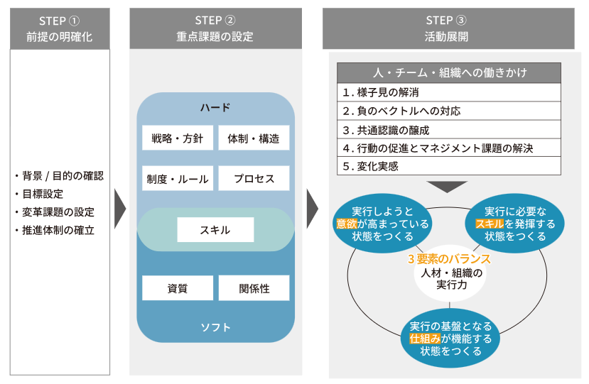 組織状態に応じて、最適な活動展開・働きかけを企画・実行し、人・チーム・組織が自分ごとで変革課題(テーマ)に取組む状態を目指します。
