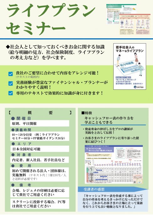 本セミナーは、社会人として知っておくべきお金に関する知識について学べる内容となっており、主に若手社員(1~3年目)を対象としています。給与明細や源泉徴収票の見方、キャッシュフロー表、ライフイベント表の作成をとおして、将来の自分自身のライフプランを描くうえで欠かせない知識をファイナンシャル・プランナーがわかりやすく解説します。