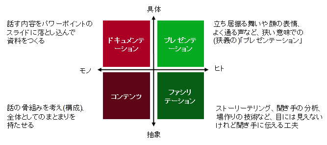 一口に「プレゼンテーション」と言っても、大きくは4分野に分かれる。ニーズに合わせて、上記を組み合わせて講座を提供します。