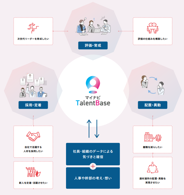 それに日々奮闘されている人事の皆さまや納得のいくキャリアを望む社員の皆さまに向けて、人材・組織開発の効果効率化をシステムとデータの力で支援する、それが「マイナビ TalentBase」です。