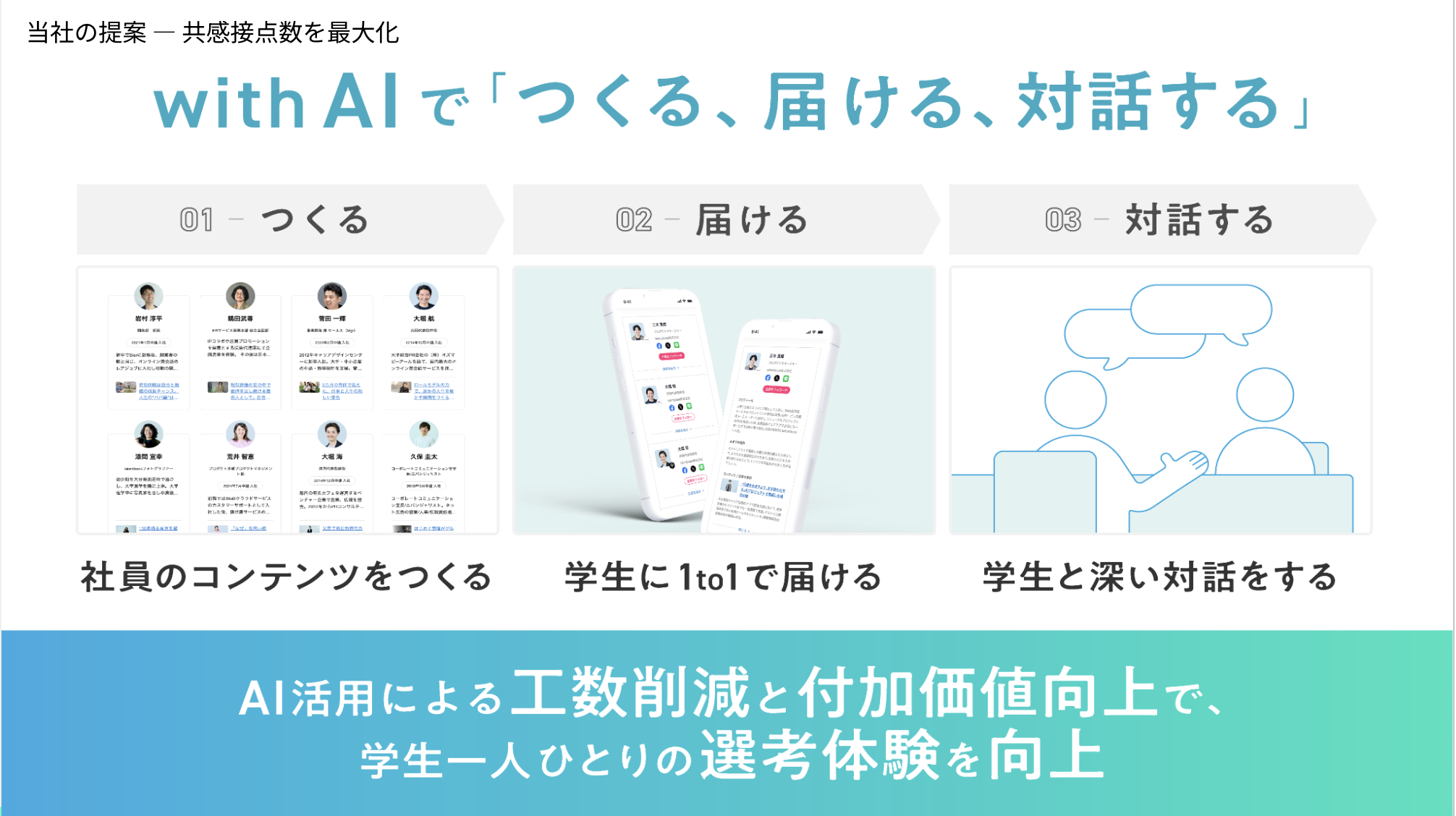 AI活用による「工数削減と付加価値向上」で、学生一人ひとりの選考体験を飛躍的に向上させます。
