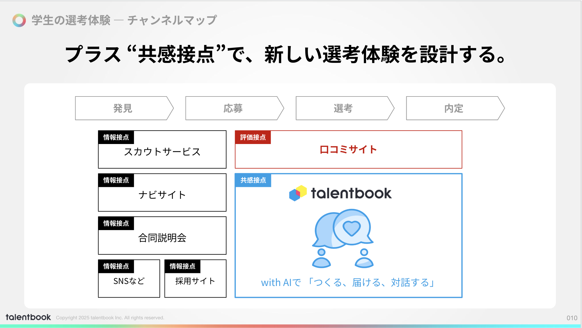タレントブックは、従来のナビサイトやスカウトなどの「情報接点」とは一線を画し、企業の採用プロセスに「共感接点」という新たなチャネルを設計します。