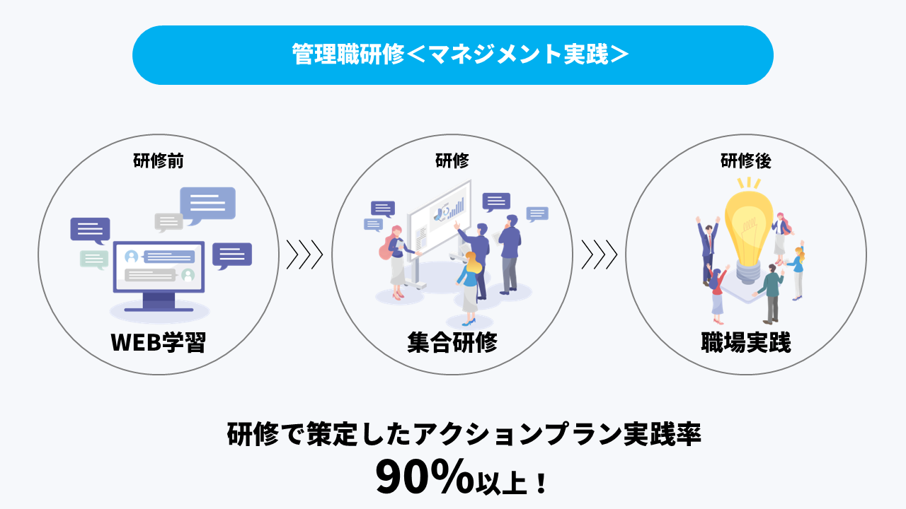 新任マネージャーの昇進時や、既任マネージャーの学び直しにも適しており、職場でのアクションプラン実践率が90%以上となっているのも特長です。研修が研修で終わらないと高評価を頂いています。
