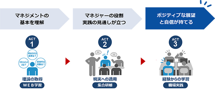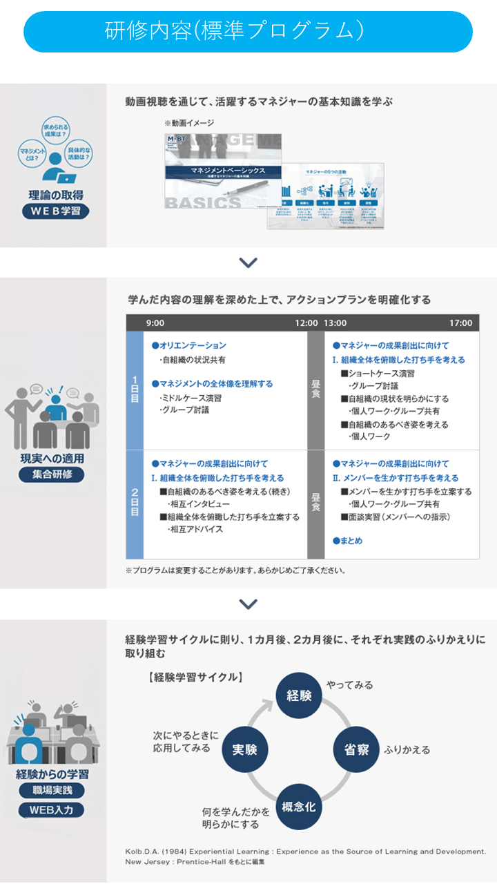 - WEB学習でマネージャーの役割や求められる成果に関する基本知識を効率的に学習。その後の集合研修では知識理解をさらに深め、実践的な知識を集中して学べます。