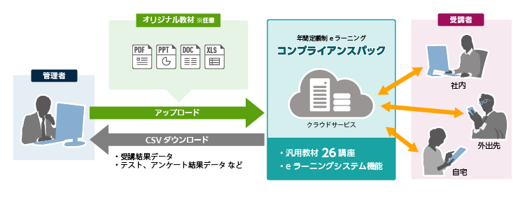 「コンプライアンスパック」は管理者機能も充実しています。コースやテスト・アンケートの進捗確認や結果集計を表示可能。進捗や結果についてはCSVでダウンロードできるので、お客様側で集計・加工ができます。
