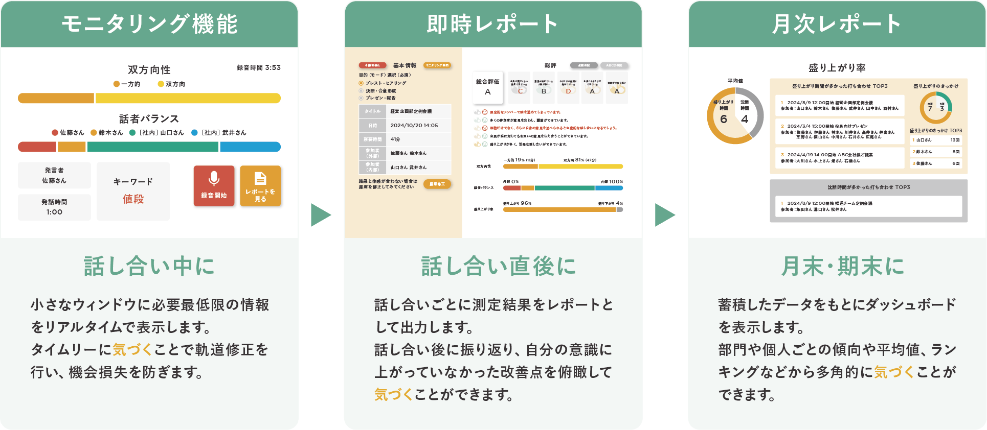 さらに、話し合い中、話し合い直後、月末・期末と3種類のレポートが出力され、3つのタイミングで多角的な「気づき」を促します。
