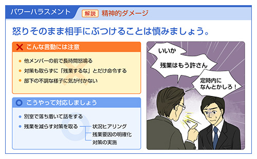 日常でよくある問題になりそうな事例やグレーゾーンとなるような事例を漫画・イラスト化しています。どのような言動に注意し「どこからがハラスメントにあたるのか」「何をしてはいけないか」「何をすべきか」を具体的にイメージし自分事化できます。また、各ハラスメントの定義や種類、どのような言動がハラスメントに該当するのか、またはしないのか、などを整理し知識として定着できます。