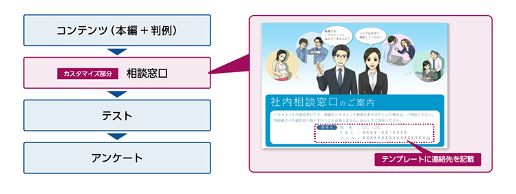 「ハラスメント防止講座の学習と合わせて、自社の相談窓口を周知したい」というご要望にお応えし、相談窓口の情報を掲載したPDF資料をハラスメント防止講座のコースとして掲載が可能です。これ以外にも、講座ページを追加したり、不要なページを削除できるテンプレートをご用意しており、カスタマイズが容易かつスピーディーに実施できます。