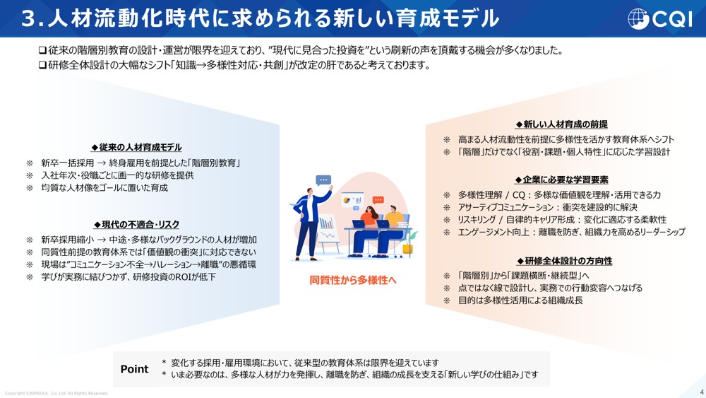 グローバル研修 with CQIは、D&Iの推進、外国人材の戦力化、外国人材の受け入れ、海外赴任者の適応力強化など様々なテーマのプログラムがございます。外国人材・受け入れ部署・組織全体などのボトルネックを発見し、課題解決する研修をカスタマイズしてご提供します。詳しくは資料をご覧ください。