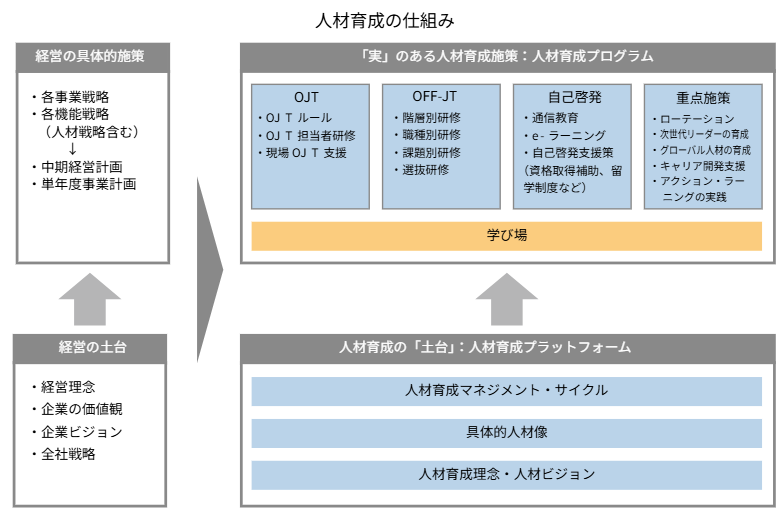 策定するOJTやOFF-JTなどの教育プログラムが「実」のあるようにするために、人材育成の土台づくりを重視して推進します。