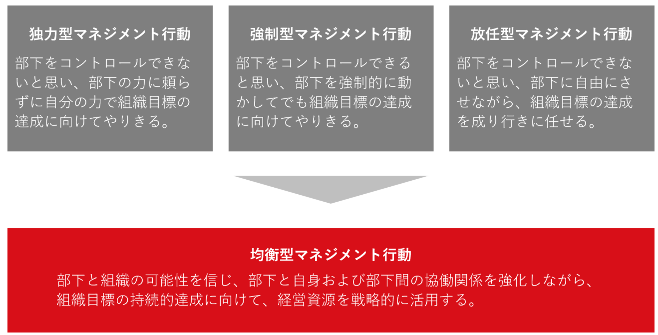 - 画一的なあるべき論の学習ではなく、参加者がマネジメントのバランスにおける癖や課題を発見します。自ら見出した課題への具体的な行動計画を策定し、実践度を強化します。