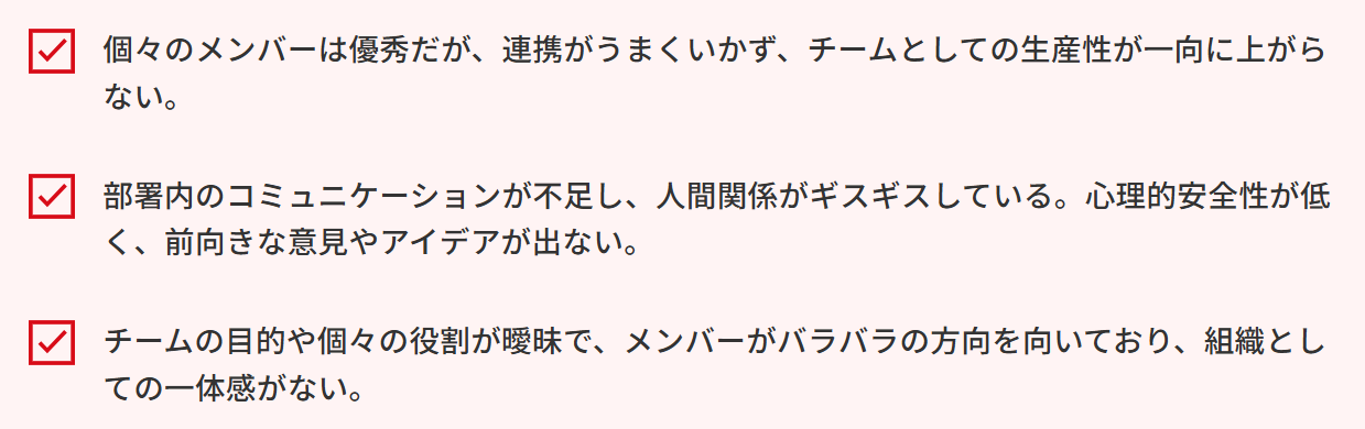- チームの心理的側面である「あり方」と機能的側面である「やり方」を両輪で扱います。信頼関係の構築と目的の明確化、プロセスの整備を通して、強い組織の土台を築きます。