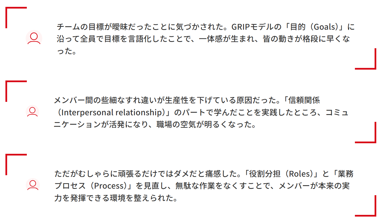 - 研修2日目は丸一日、自組織の改善計画を立案。GRIPモデルに沿い、組織の理想像、役割、信頼関係、業務プロセスを具体的に設計し、即実践可能なプランを持ち帰ります。