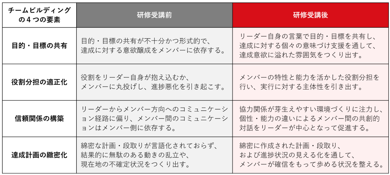 私たちの提供するチームビルディング研修は、弊社が介入してチーム作りを手伝う研修ではなく、貴社のリーダー社員自身が「良いチーム」を作れる力を身に着ける研修です。
