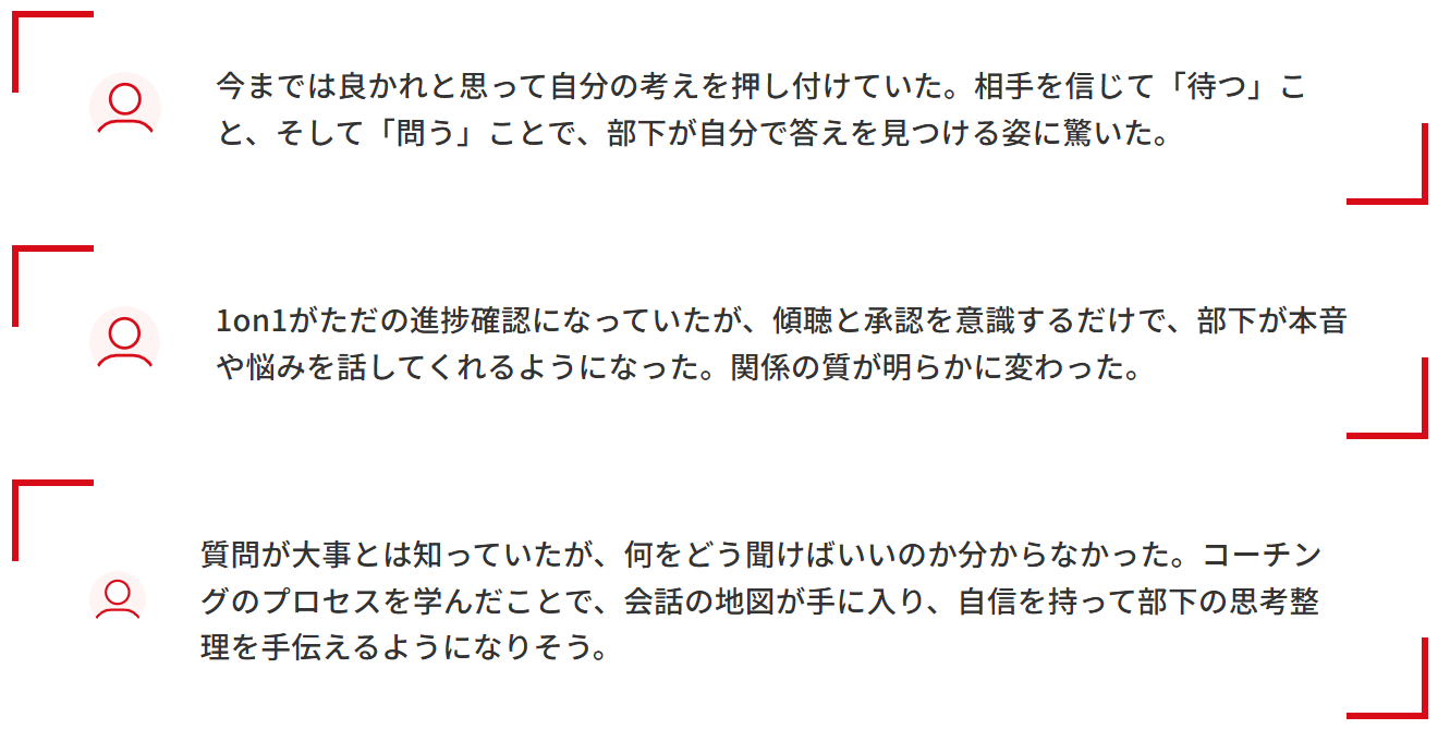 - コミュニケーションの土台となる「傾聴」「質問」「承認」を徹底習得。コーチングの場のみならず、日々の1on1や会議など、あらゆる対話の質を向上させます。