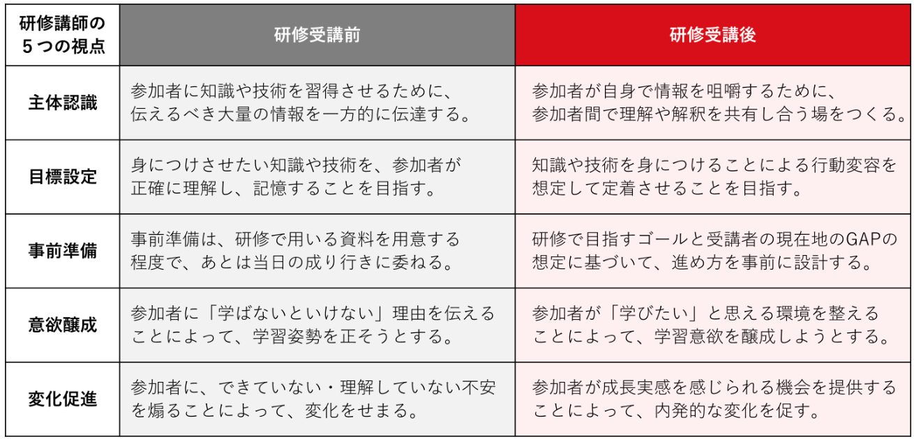 - 学習効果を高める「設計思想」と「指導スタンス」を習得。論理的な5つのステップで研修ゴール設定から評価までをデザインし、質の高い研修を企画できるようになります。