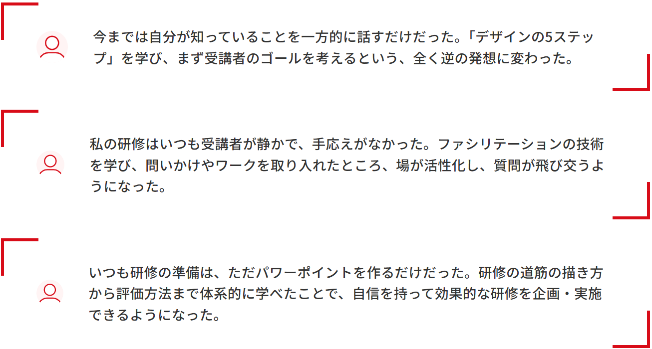- 研修の一部設計・実演を通じ、自身の「指導スタンス」と課題を明確化。実践と内省を繰り返すことで、スキルとマインドの両面で着実な成スキルアップを図ります。