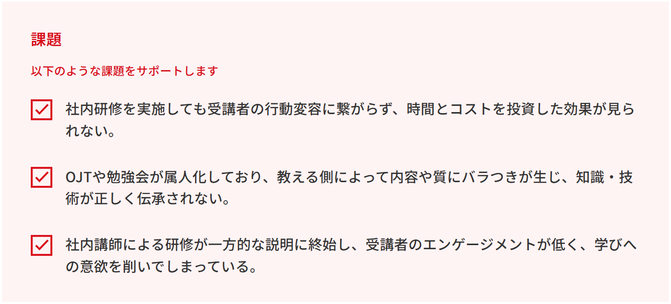 そして、各企業に合わせたカスタマイズおよび受講生自身が課題に気づき自身の課題に対する計画を立てることで、本人の行動変容・定着につなげています。