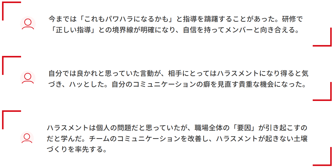 - ハラスメント防止と「正しい指導」の両立は可能であるという前提に立ち、部下の成長を促すフィードバックスキルを習得し、自信を持って指導できる状態を目指します。