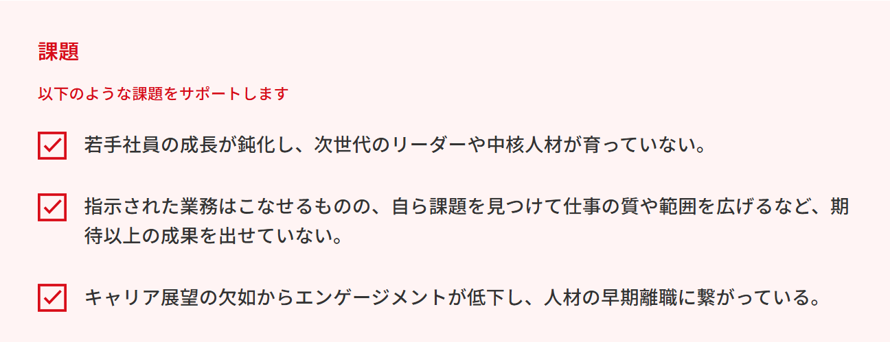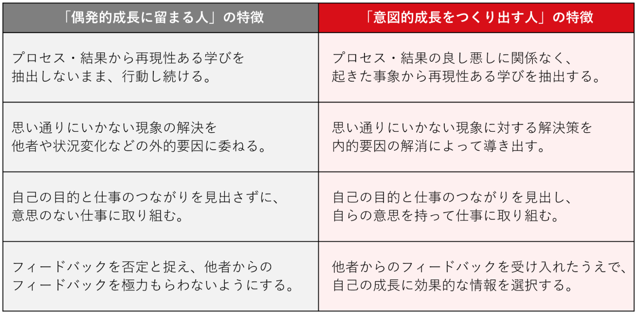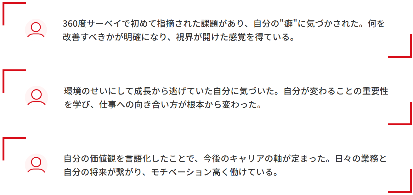 客観的な自己分析を通じて成長課題を特定し、偶発的成長から脱却。意図的に自己の成長を創り出す人材への変革を促します。