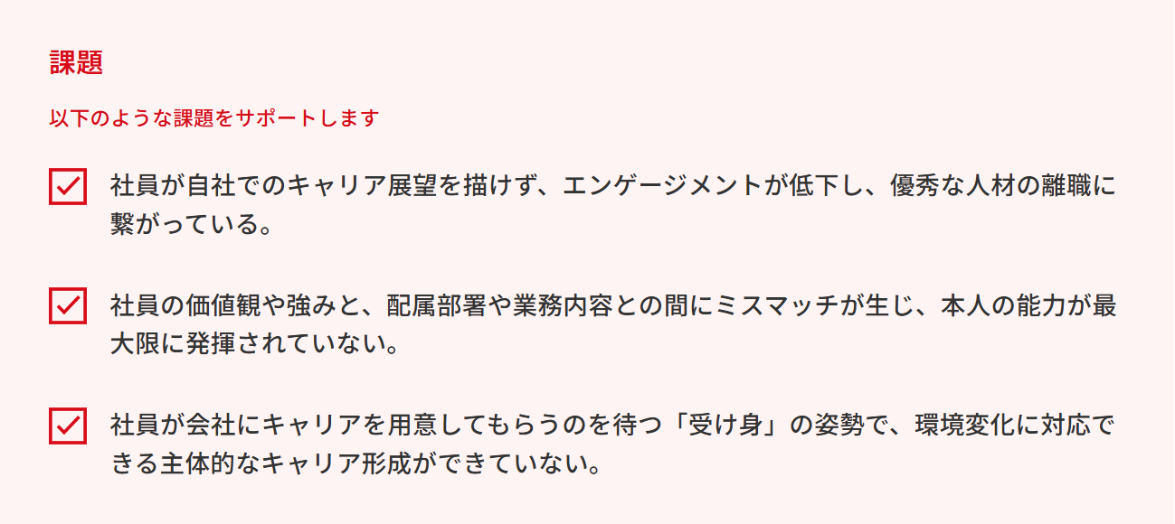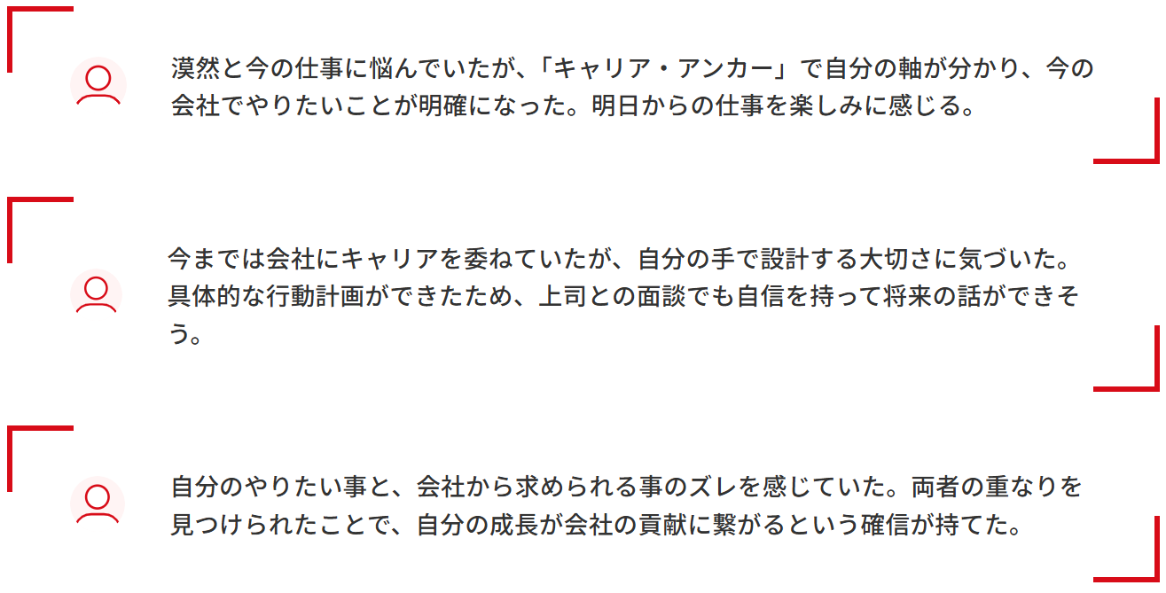- 体系的な自己分析を通じ、個人の価値観と組織の方向性を接続。個人と組織の両者が共に成長できるWin-Winの共通領域を明確に発見します。