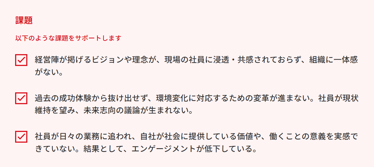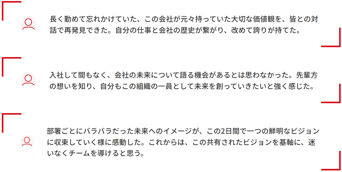 - 個人と組織の「過去」を振り返り、価値観を再発見。共有された土台の上に立つことで、説得力と納得感のある「未来」のビジョンを共に描き出します。
