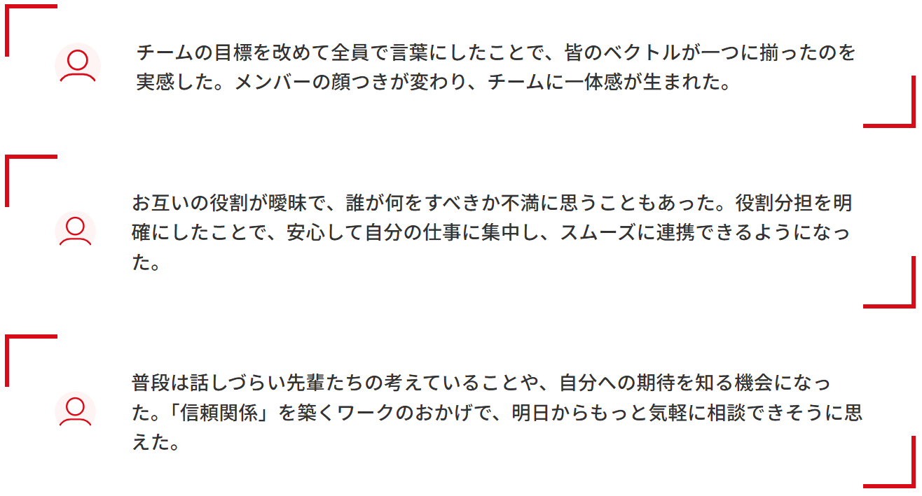 - 体感型ワークを通じ、自チームの力学を「自分ごと」として体験。メンバーの本音と、チーム変革への高い当事者意識を全員に醸成します。