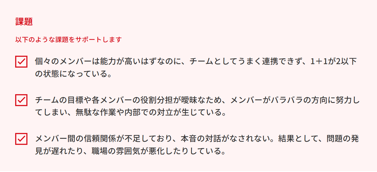 チームメンバー全員で参加し、個の力を結集して相乗効果を生み出す「ハイパフォーマンスチーム」を構築するためのプログラム