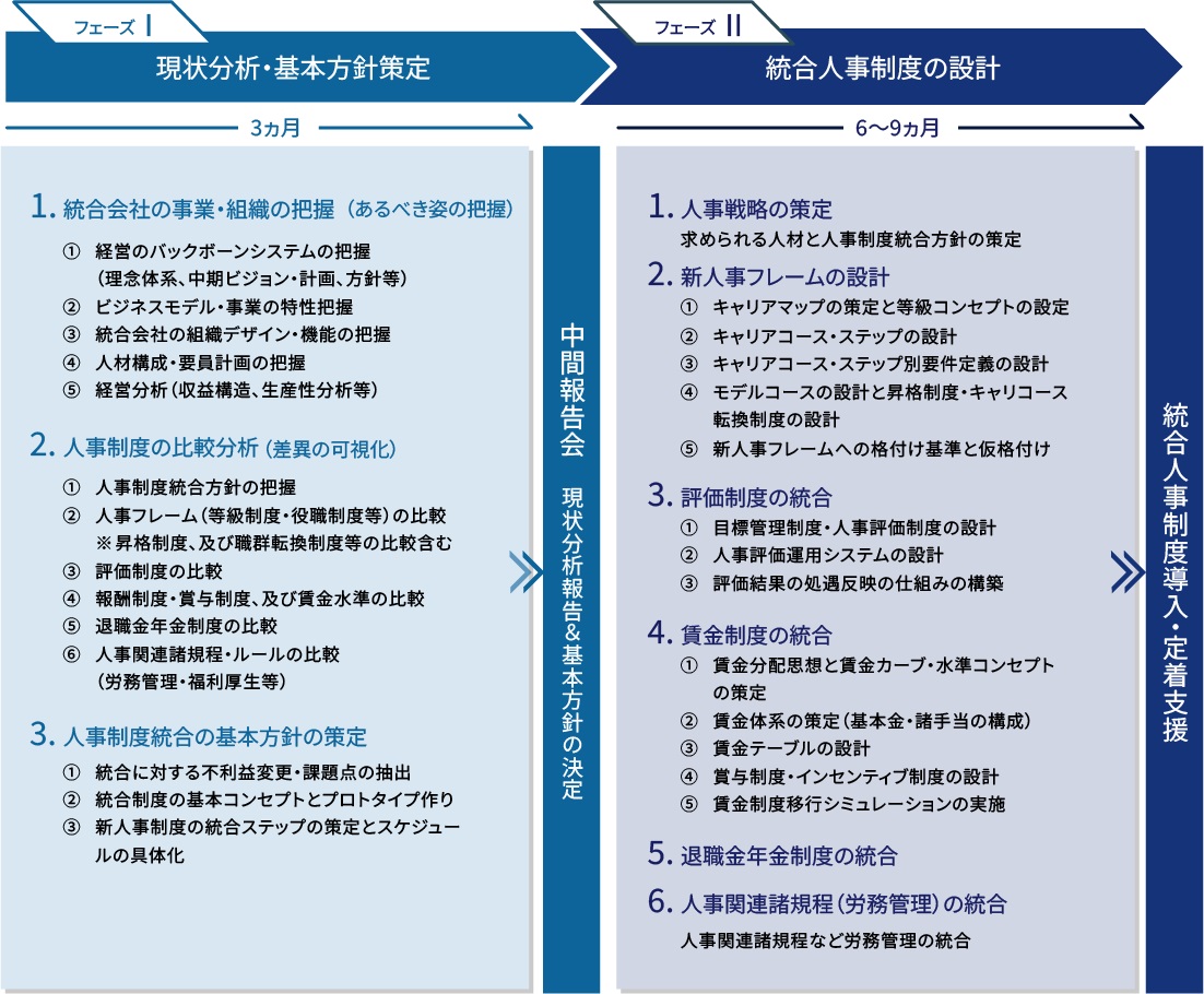 人事PMI・人事制度統合コンサルティングの支援内容と全体像です。