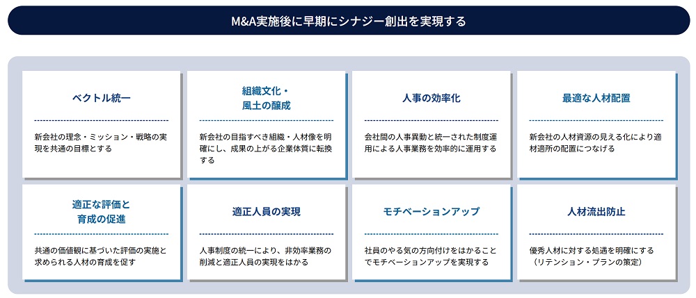 新会社の理念・ミッション・戦略を推進する「人材マネジメント」の仕組みを明確にすることで、早期のシナジー創出の実現をはかります。