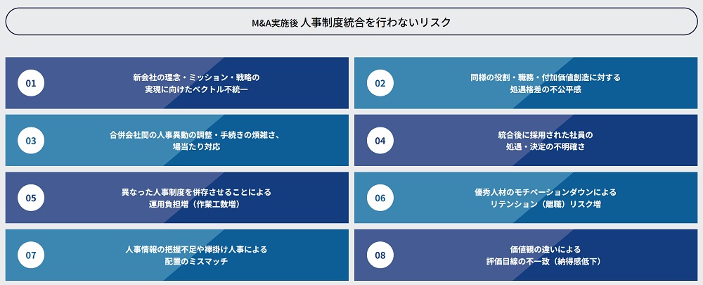 しかしながら、(2)のインベストメント・モデルの場合を除いて、統合後にシナジー創出するには、人事制度の統合は必要不可欠です。統合後に、速やかに人事制度の統合が行われなければ、以下のようなリスクを抱えたままの事業経営となります。