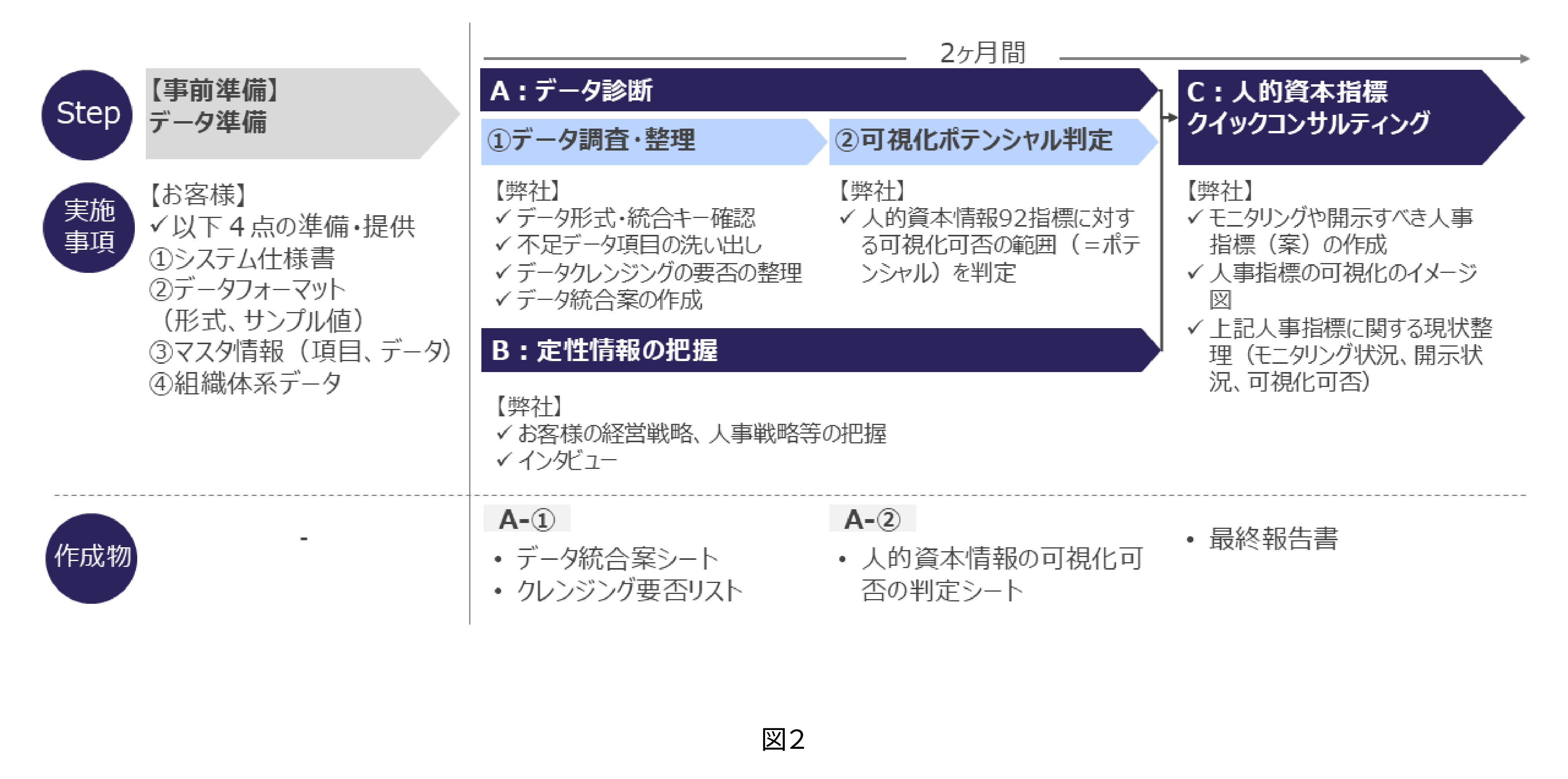 ・お客様が保持するシステムデータをデータ基盤へ取り込み、データの中身の調査、データ統合に必要な調査、人的資本情報の可視化可能な範囲の診断を行います(図「A:データ診断」参照)。