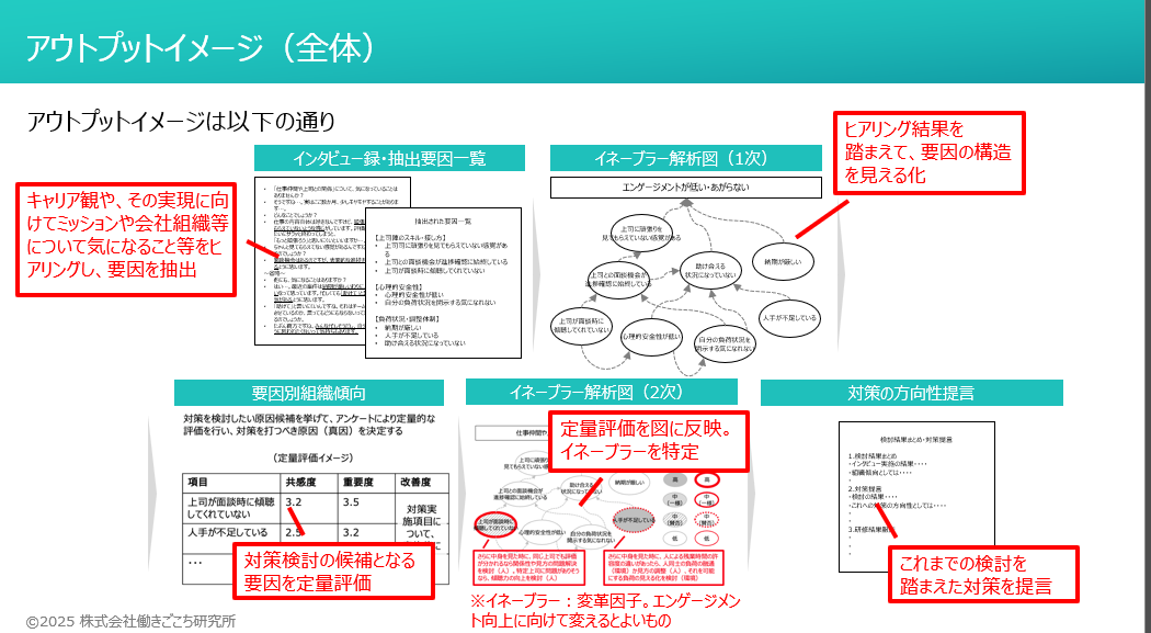 エンゲージメント向上に向けた対策検討や効果検証をしやすくなるように、原因の具体的状況と因果関係を、現場へのインタビューやワークショップを通じて見える化し、対策検討をご支援することです。