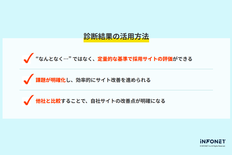 採用サイト無料診断を活用することで、定量的な基準で採用サイトの評価が可能です。