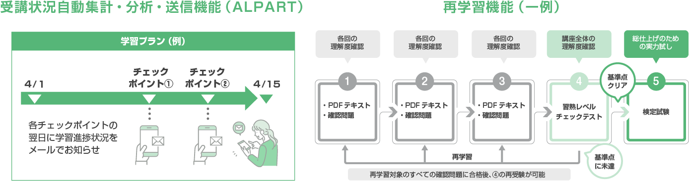 ■受講状況自動集計・分析・送信機能(ALPART:アルパート)では、「学習進捗状況の集計・分析」と「受講者フォロー」の自動化が可能です。