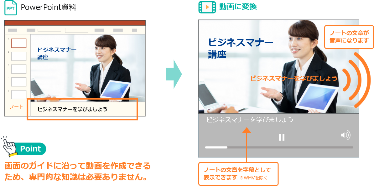 ■ 録音・撮影不要!PowerPoint資料から、音声付動画を" 誰でも・簡単に " 作成できます。