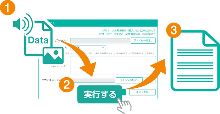 ・音声や文書(PDF・PowerPoint・Excel・Word)、画像ファイルを指定して「実行」ボタンを