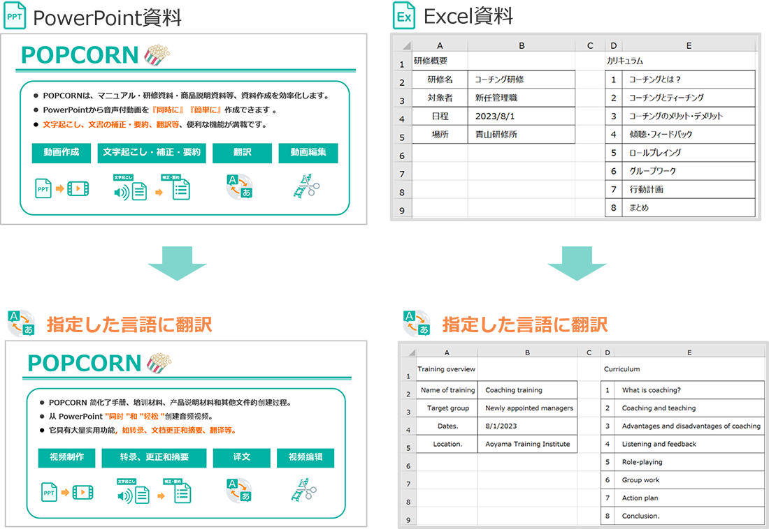 - 翻訳は50種類以上の言語に対応。POPCORNなら動画作成と同時に翻訳でき、資料の翻訳も可能なため、他言語を使用する社員にも教育コンテンツを迅速に展開できます。