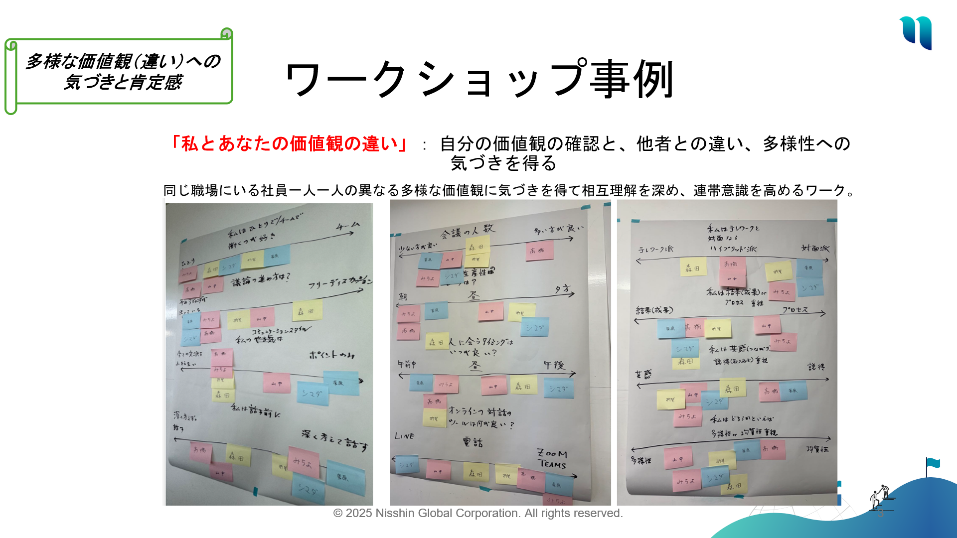 同じ職場にいる社員一人一人の異なる多様な価値観に気づきを得て相互理解を深め、連帯意識を高めるワーク。