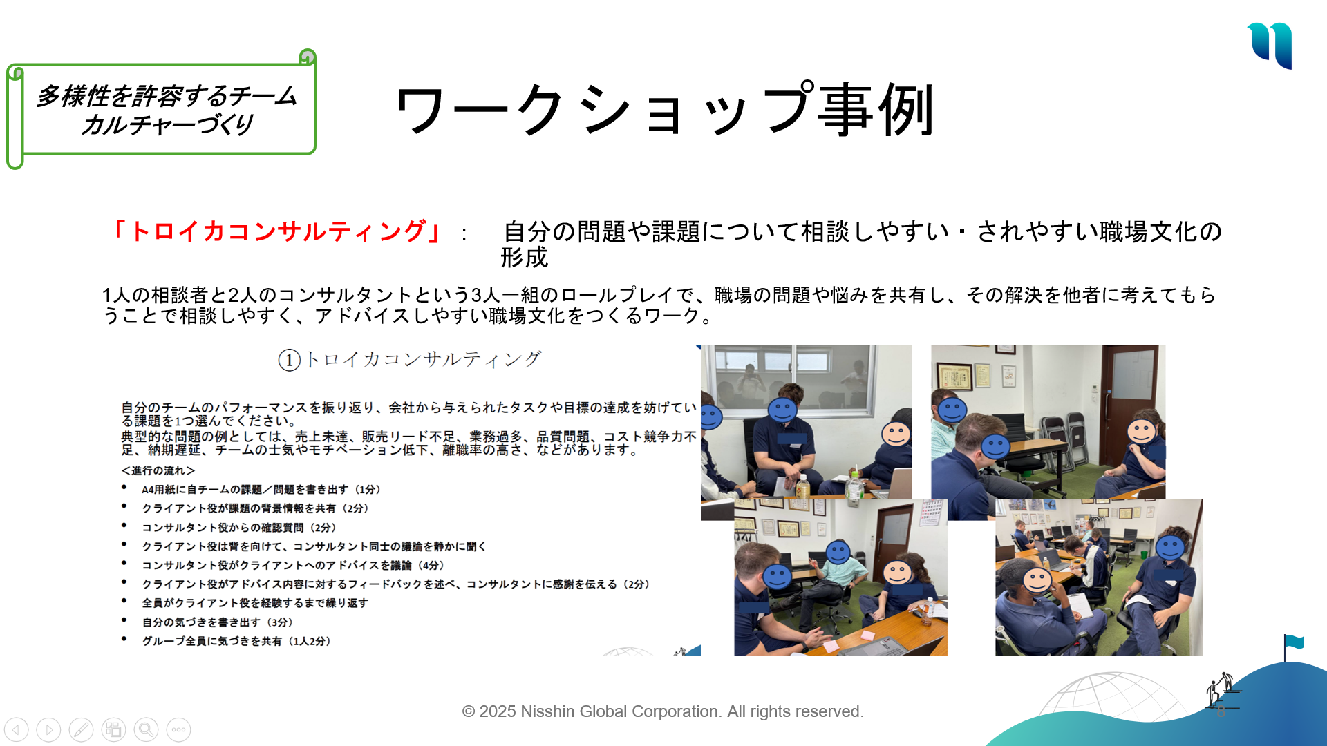1人の相談者と2人のコンサルタントという3人一組のロールプレイで、職場の問題や悩みを共有し、その解決を他者に考えてもらうことで相談しやすく、アドバイスしやすい職場文化をつくるワーク。