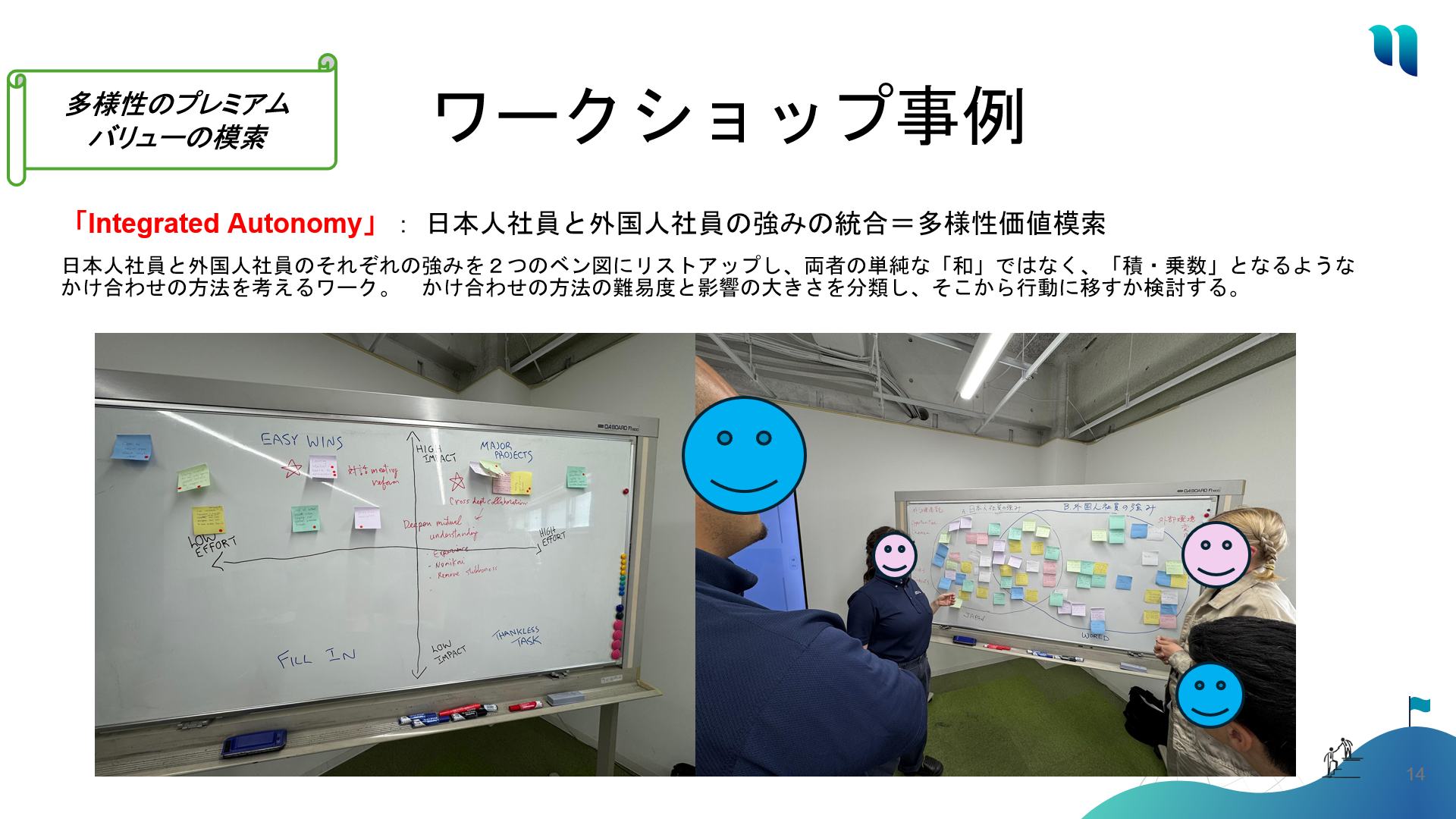 日本人社員と外国人社員のそれぞれの強みを2つのベン図にリストアップし、両者の単純な「和」ではなく、「積・乗数」となるような かけ合わせの方法を考えるワーク。 かけ合わせの方法の難易度と影響の大きさを分類し、そこから行動に移すか検討する。
